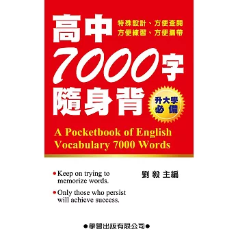 | 搜尋參考資料: 1. 博客來-高中7000字隨身背 2014年8月15日 ... 書名:高中7000字隨身背,語言:繁體中文,ISBN:4713269380832,頁數:238,出版社:學習出版社,作者:劉毅,出版日期:2014/08/15,類別:語言 ... 2. 三民網路書店>高中7000字隨身背(口袋書)-劉毅 光讀課本單字,難的單字出現頻率低,卻是考試勝敗的關鍵。這本口袋書的目的,是讓你考前將7000字,做地毯式的複習。按照字母排列,為了方便查閱,書的大小讓你 ... 3. 高中7000字隨身背-金石堂網路書店 2014年8月15日 ... 高中7000字隨身背,作者:劉毅,出版社:學習出版有,ISBN:4713269380832. 4. 高中7000字測驗題庫(黃色底)-金石堂網路書店 2011年12月2日 ... 高中7000字測驗題庫(黃色底),作者:劉毅,出版社:學習出版有,ISBN:9789862311547. ... 高中7000字隨身背 ... 高中7000字測驗題庫」以大考中心公佈的「高中常用7000字」為範圍,完全依照「學測」與「指考」詞彙題的命題趨勢,精心 ... 5. 高中常用7000字解析【豪華版】-金石堂網路書店 2015年1月9日 ... 高中常用7000字解析【豪華版】,作者:劉毅,出版社:學習出版有 ... 高中7000字隨身背. 一口氣 ... 難背的單字,有「記憶技巧」、「同義字」,及「反義字」。 |
